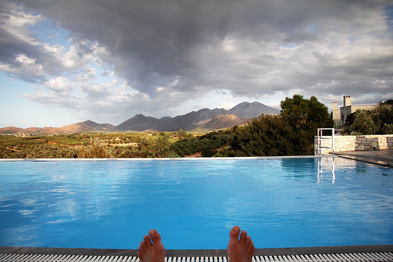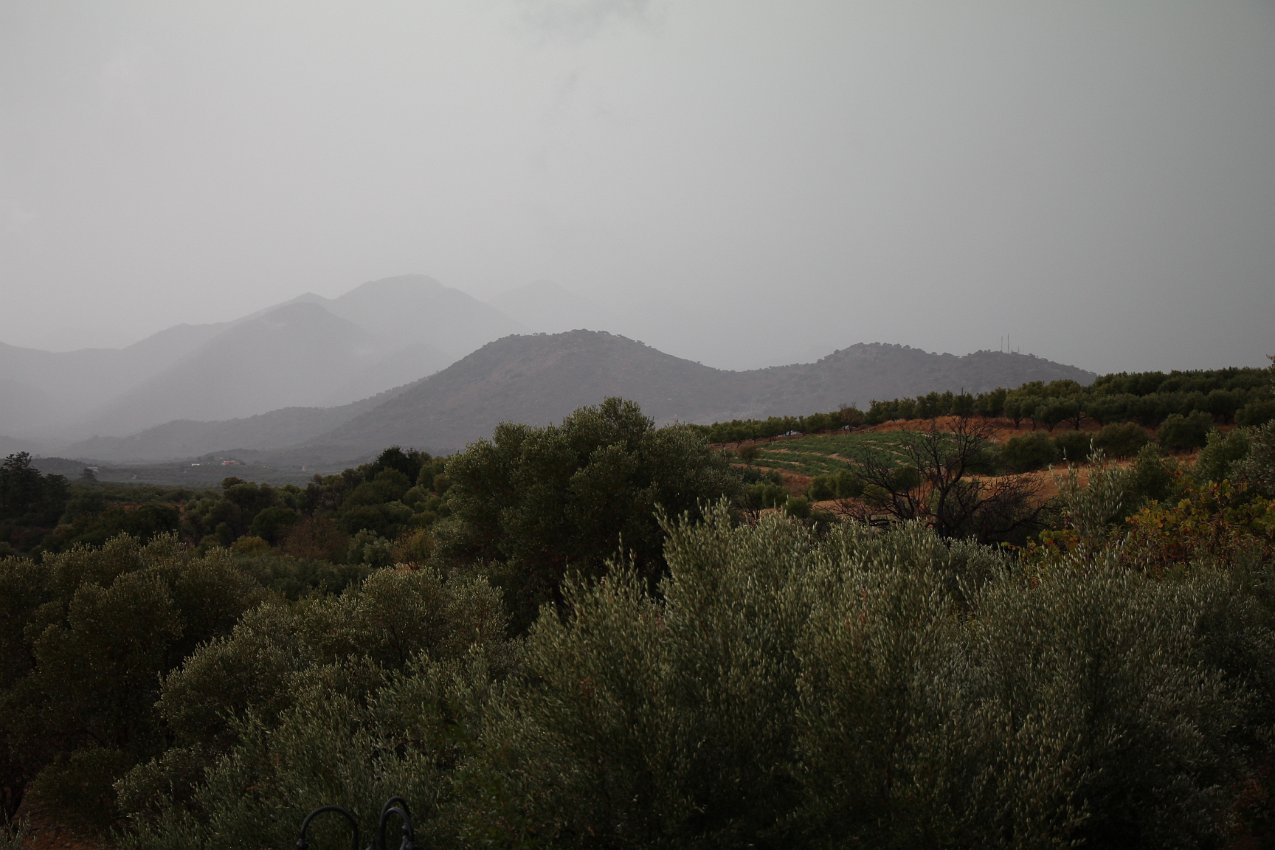 1 This was about the only rain we saw on Crete, seen from our balcony at Dalabelos. We spent five nights there on the north coast, enjoying the gorgeous view, delicious food, nice dogs, charming host and live Cretan music.