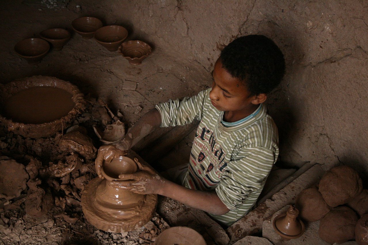 7Draa Valley A young potter -- he sits in a whole and turns the wheel with foot pedals