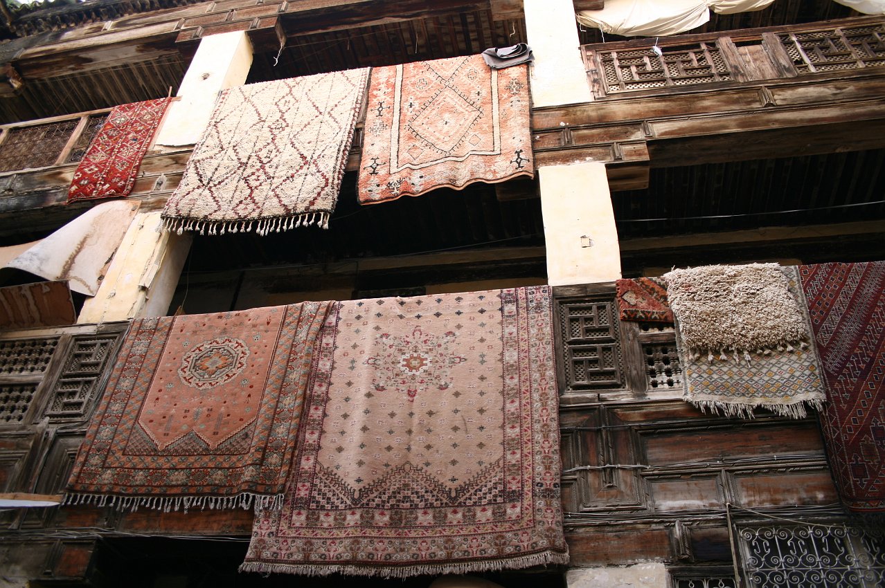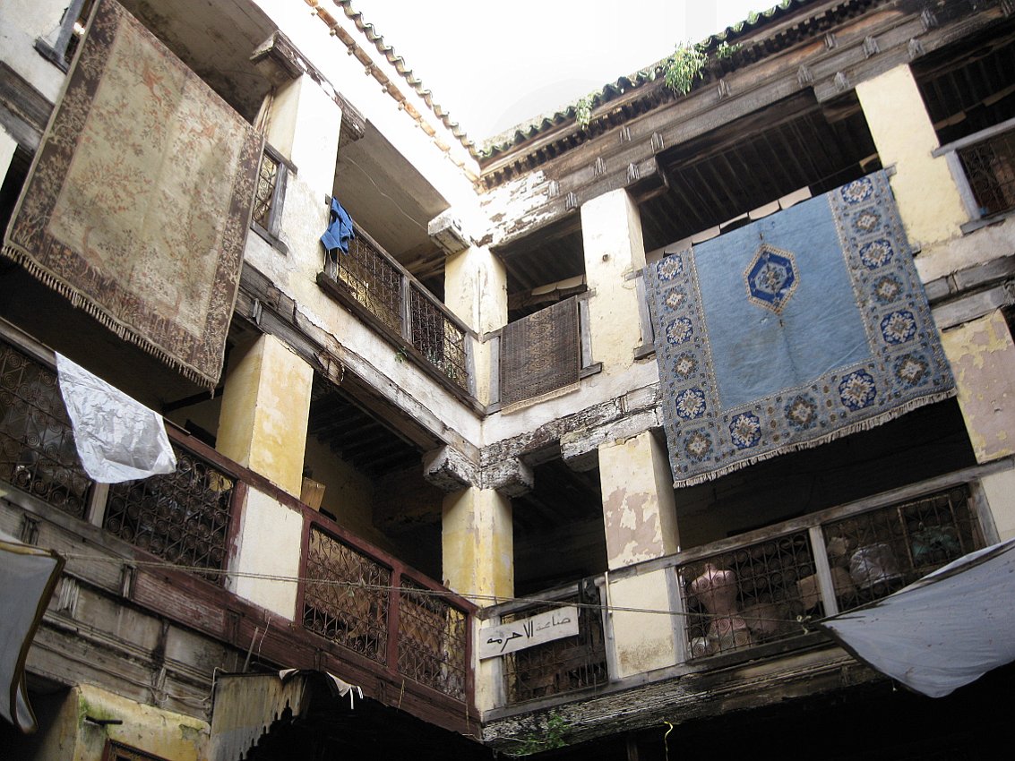 19Fez Carpets sunning on the balconies in a fondouq (courtyard complex once used by caravans, now housing artisans)