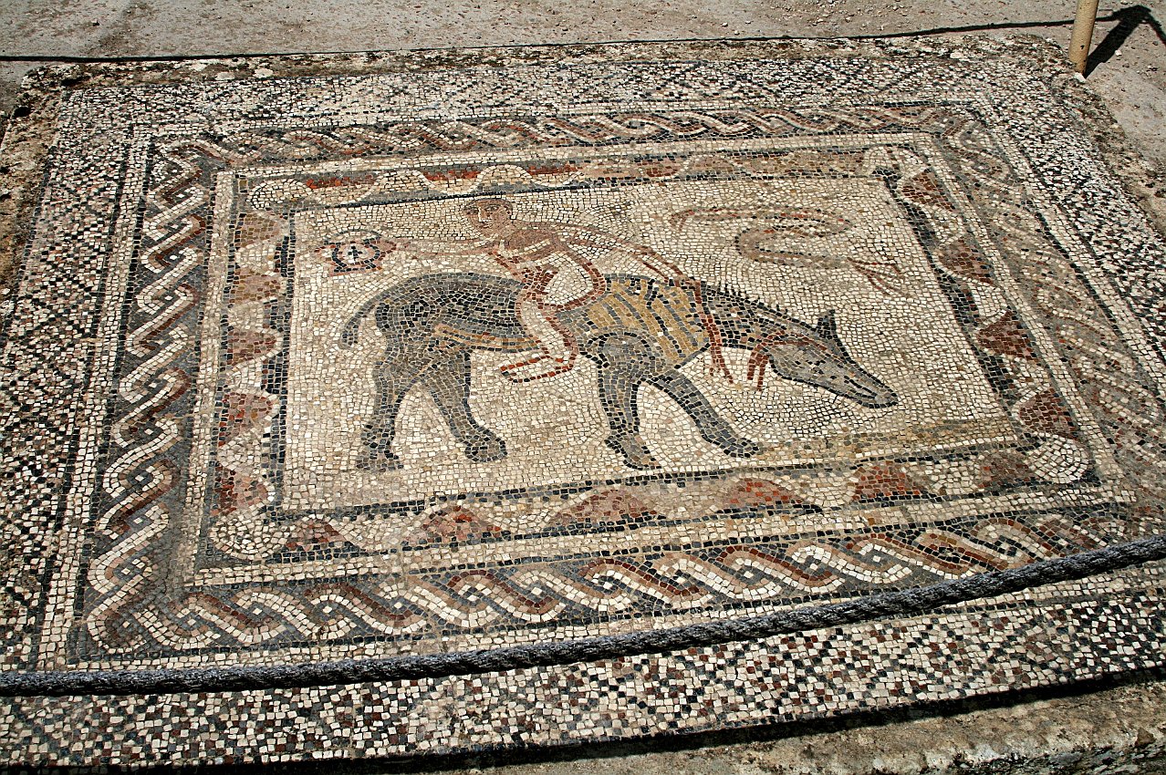 20 Volubilis Roman mosaic of a fool, riding backwards on a donkey |